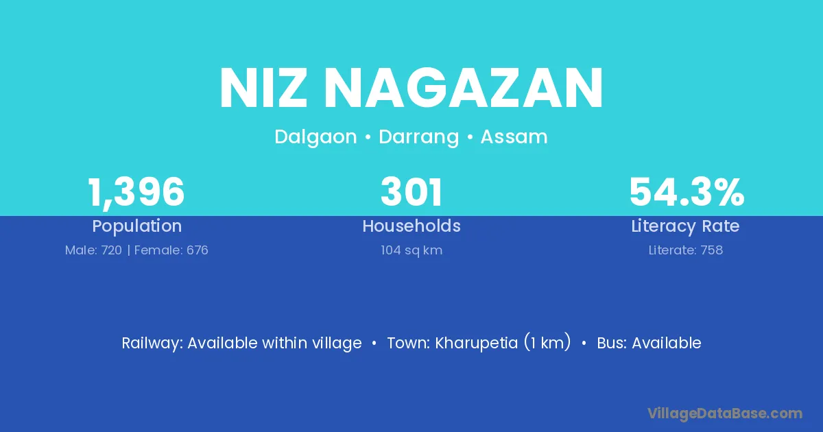 Kharupetia (1 km) is the nearest town to Niz Nagazan village for major economic activities and is located approximately 1 km away.