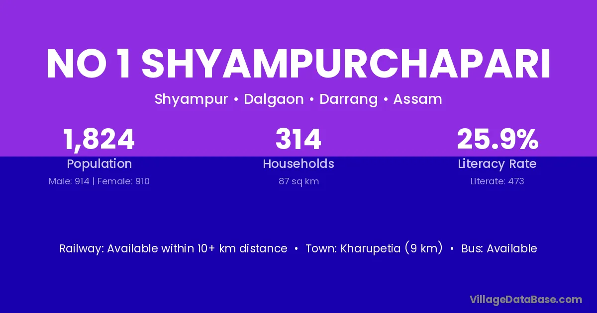 No 1 Shyampurchapari village has a total population of 1,824 people, of which 914 are males and 910 are females.
