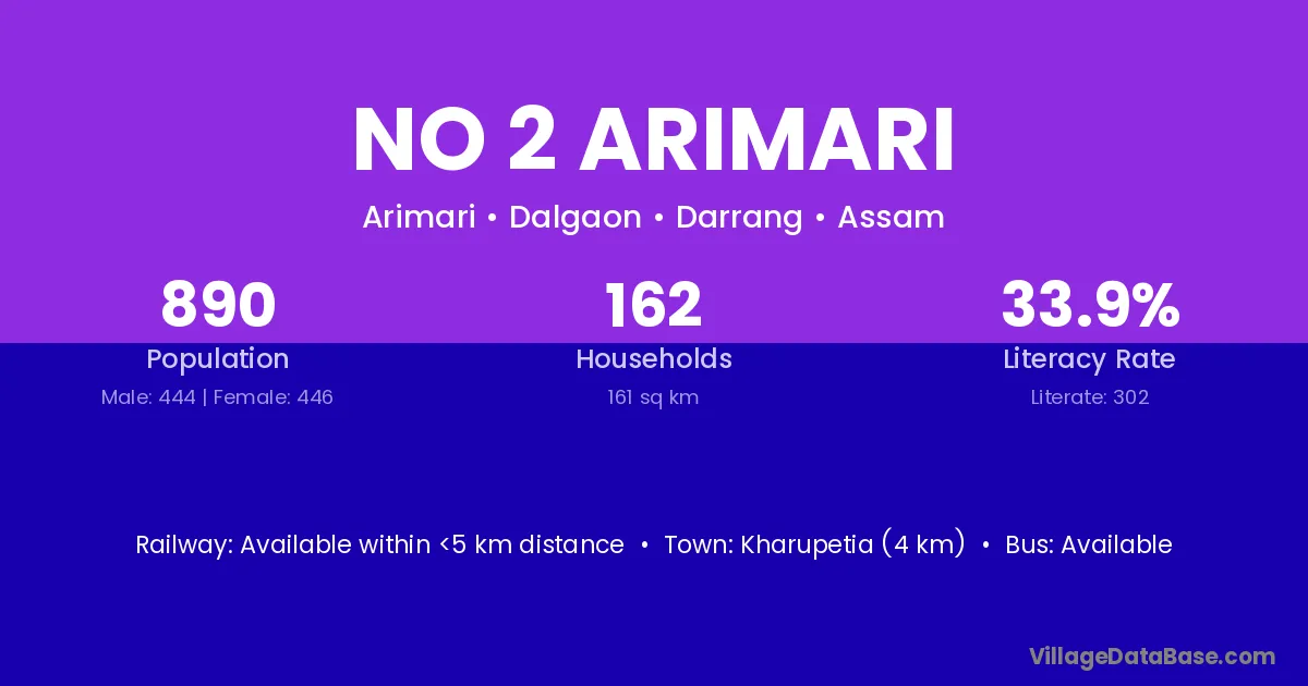 Kharupetia (4 km) is the nearest town to No 2 Arimari village for major economic activities and is located approximately 4 km away.
