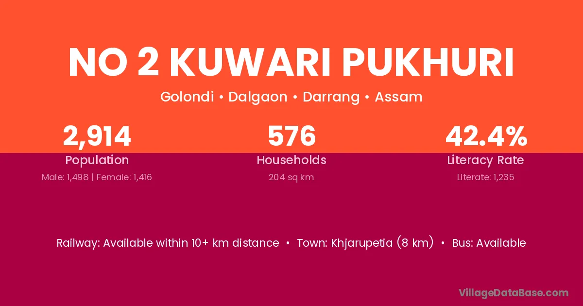 Khjarupetia (8 km) is the nearest town to No 2 Kuwari Pukhuri village for major economic activities and is located approximately 8 km away.