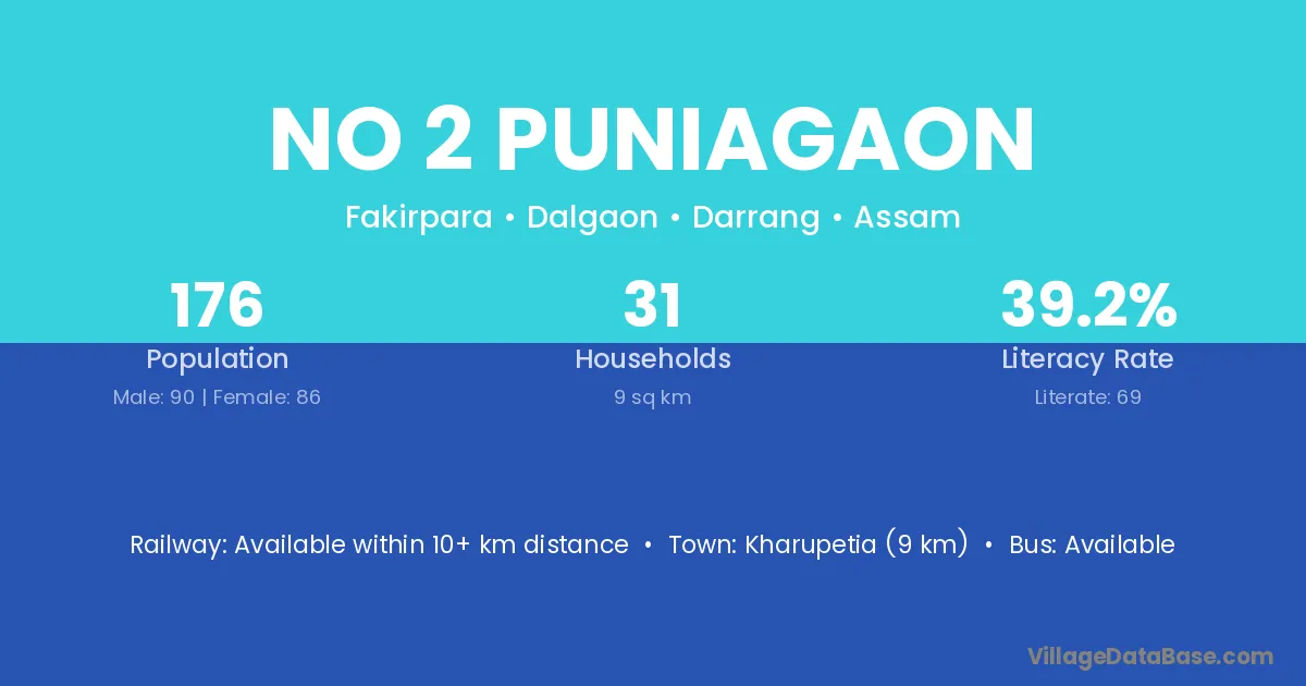 Kharupetia (9 km) is the nearest town to No 2 Puniagaon village for major economic activities and is located approximately 9 km away.