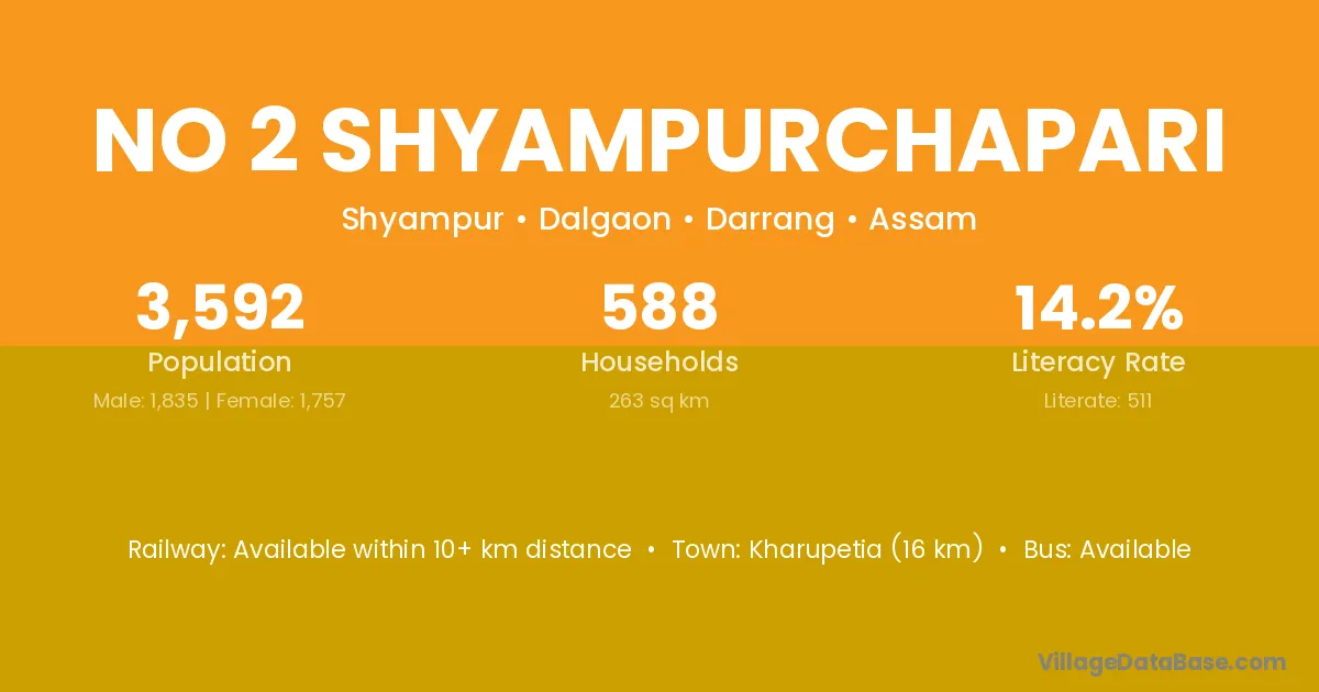Kharupetia (16 km) is the nearest town to No 2 Shyampurchapari village for major economic activities and is located approximately 16 km away.