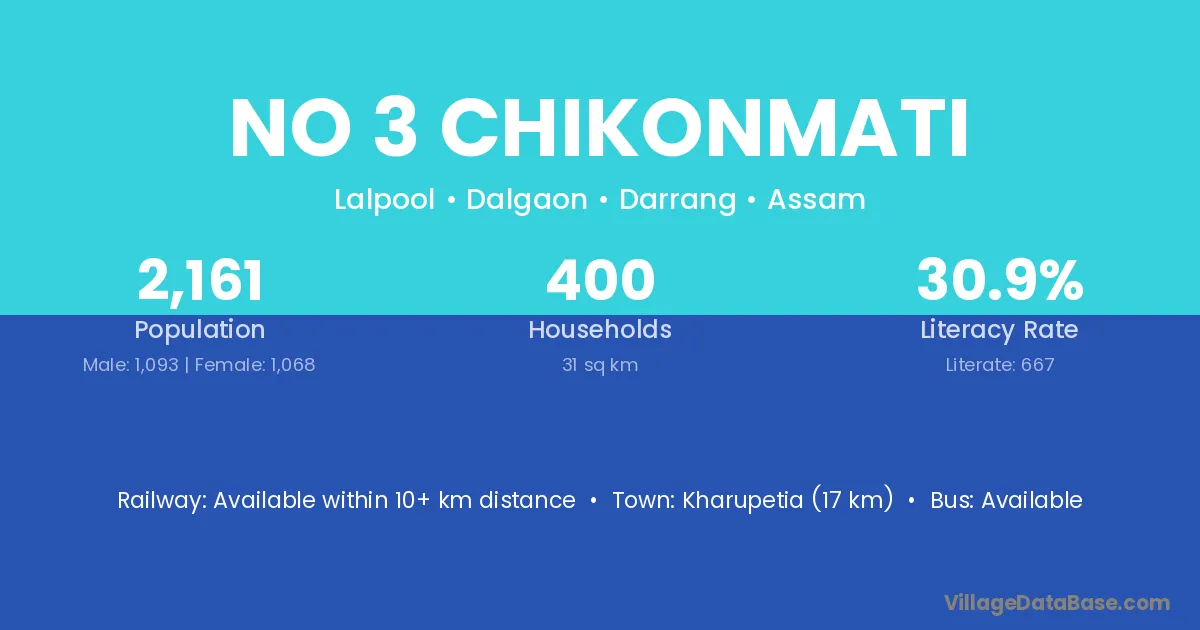 Kharupetia (17 km) is the nearest town to No 3 Chikonmati village for major economic activities and is located approximately 17 km away.