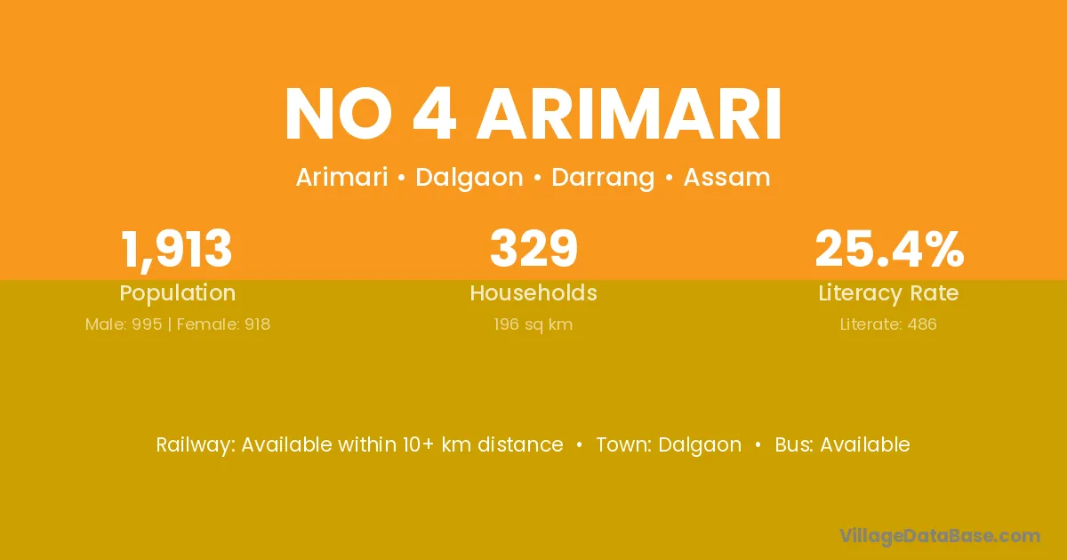 No 4 Arimari village has a total population of 1,913 people, of which 995 are males and 918 are females.