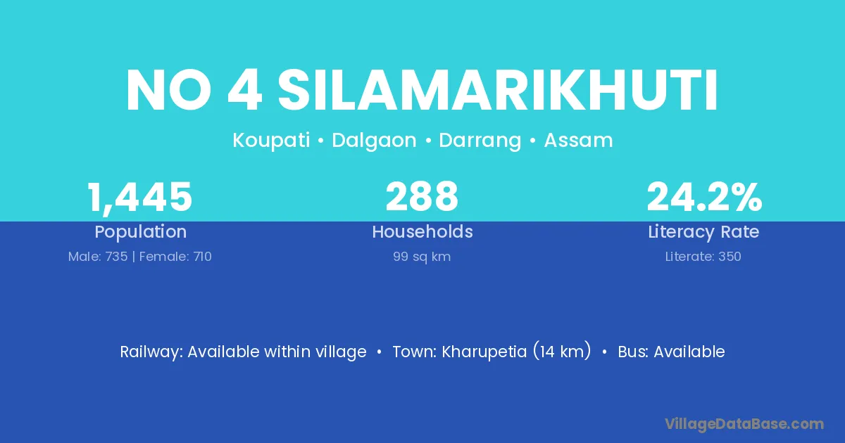Kharupetia (14 km) is the nearest town to No 4 Silamarikhuti village for major economic activities and is located approximately 14 km away.