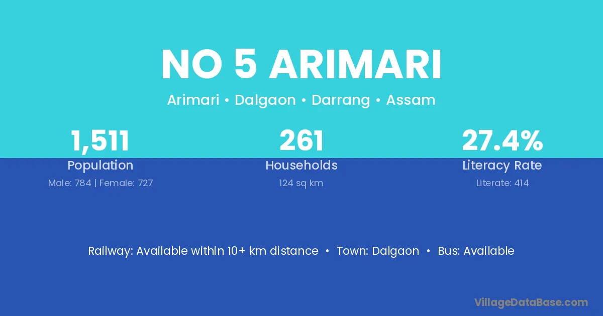 No 5 Arimari village has a total population of 1,511 people, of which 784 are males and 727 are females.