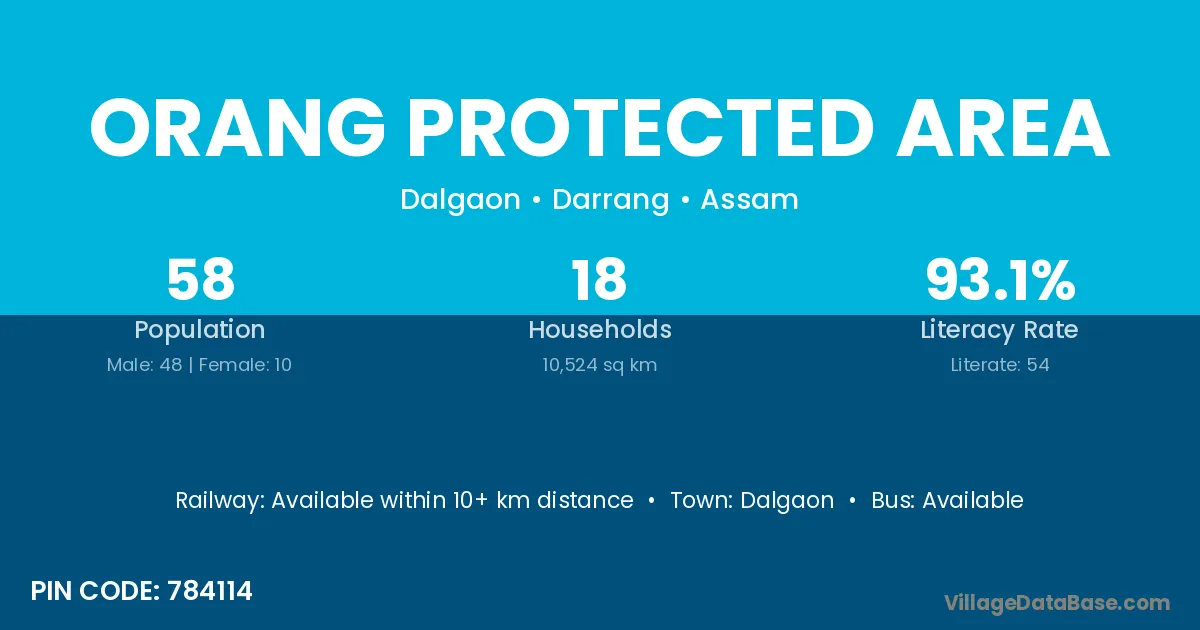 The literacy rate of Orang Protected Area village is 93.10%. Male literacy stands at 93.75% and female literacy at 90.00%.