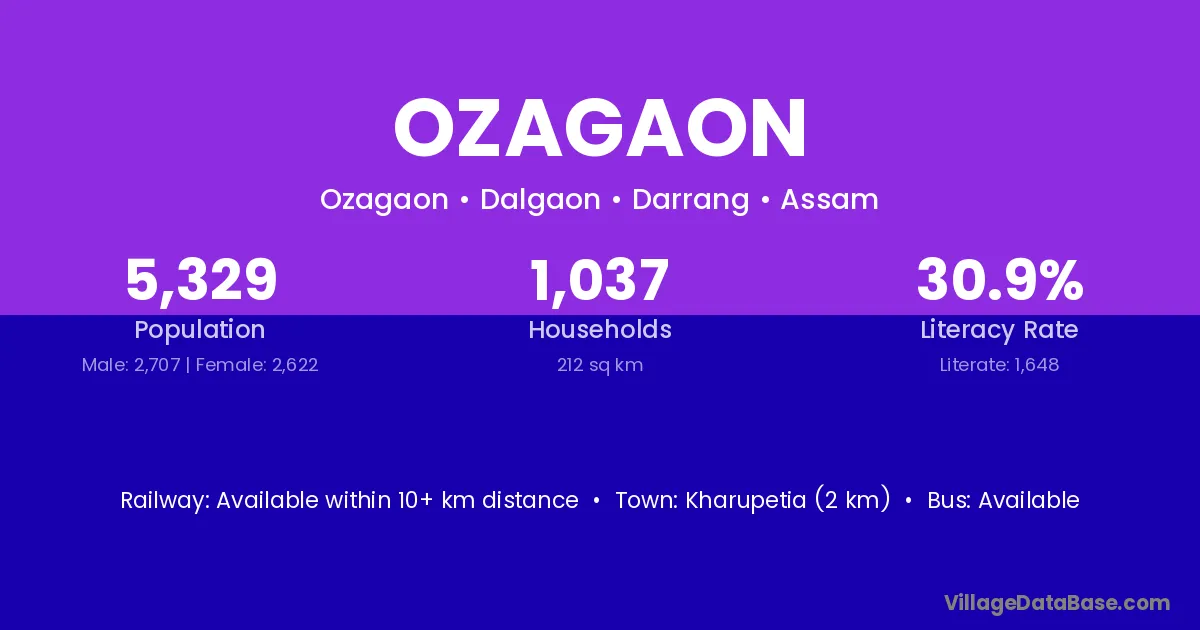 Kharupetia (2 km) is the nearest town to Ozagaon village for major economic activities and is located approximately 2 km away.