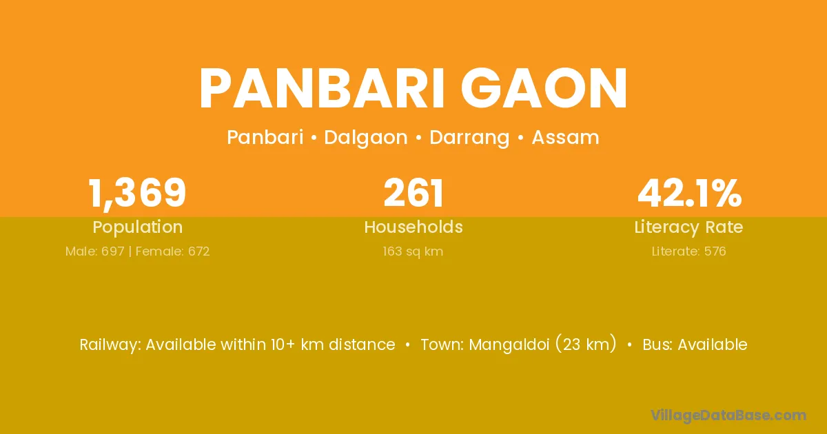 Panbari Gaon village has a total population of 1,369 people, of which 697 are males and 672 are females.