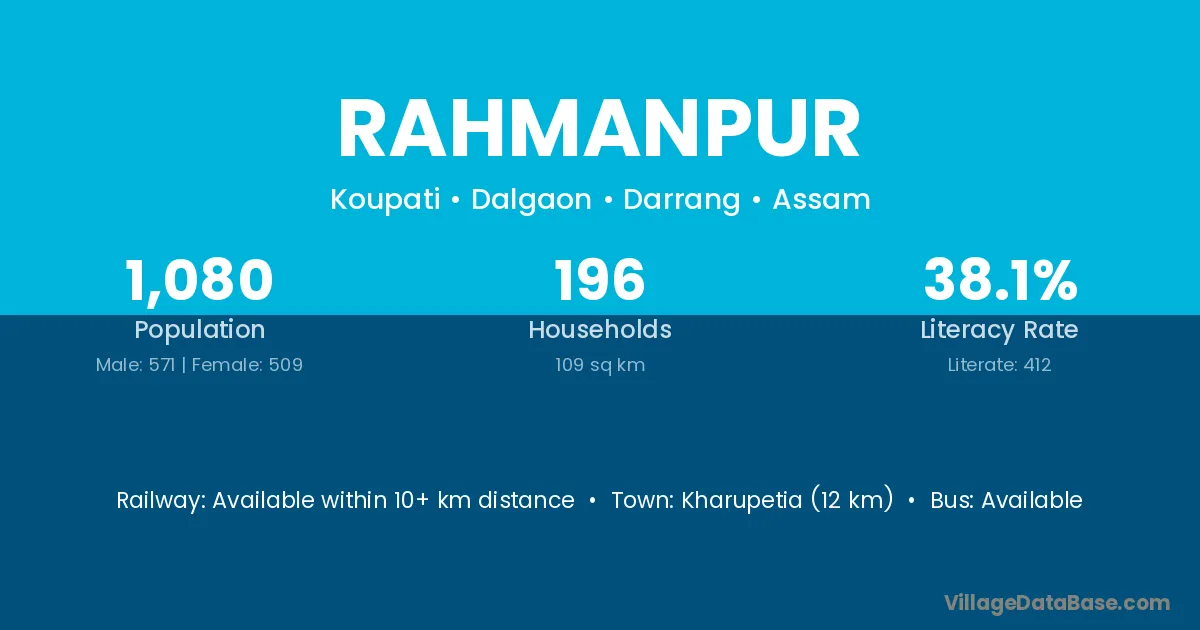 Kharupetia (12 km) is the nearest town to Rahmanpur village for major economic activities and is located approximately 12 km away.