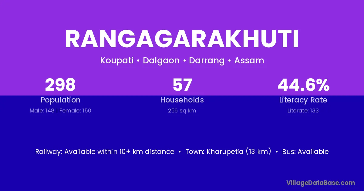 Kharupetia (13 km) is the nearest town to Rangagarakhuti village for major economic activities and is located approximately 13 km away.