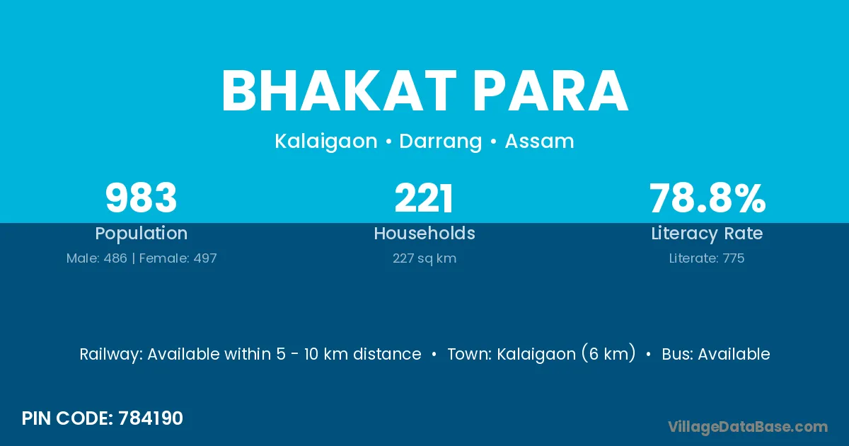 Kalaigaon (6 km) is the nearest town to Bhakat Para village for major economic activities and is located approximately 6 km away.