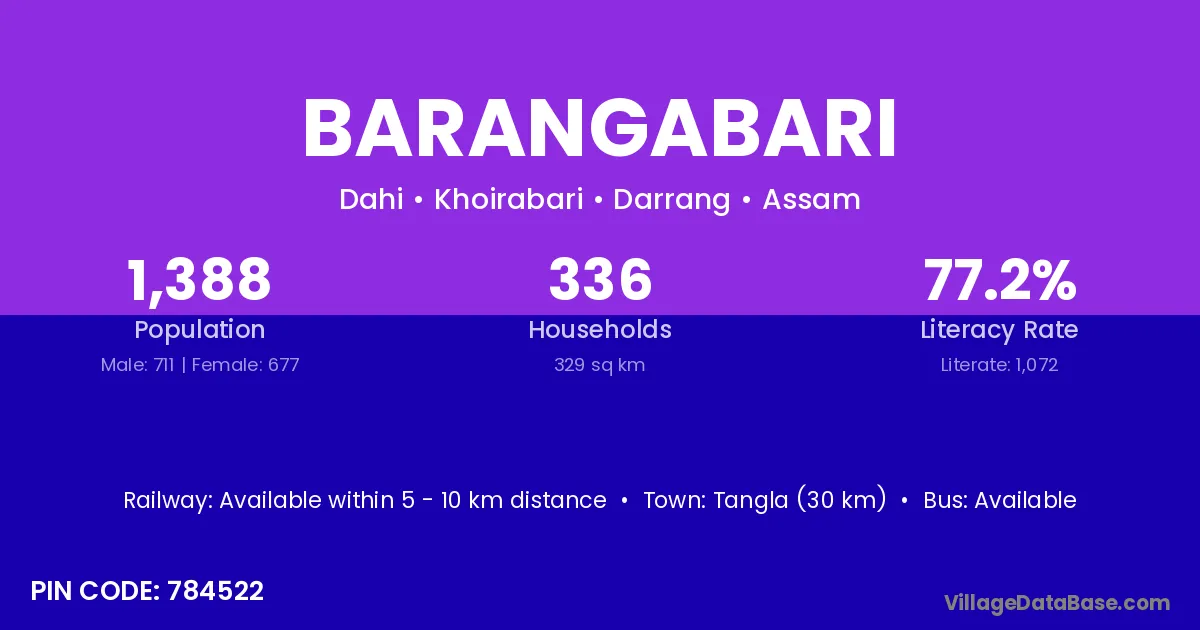 Tangla (30 km) is the nearest town to Barangabari village for major economic activities and is located approximately 30 km away.