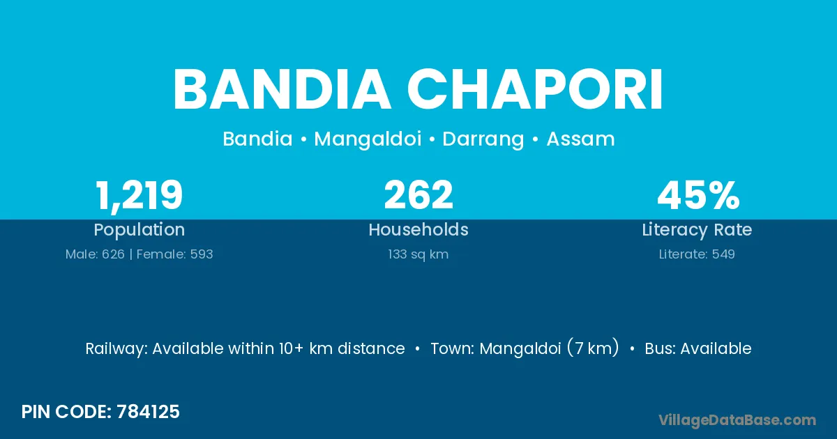 Mangaldoi (7 km) is the nearest town to Bandia Chapori village for major economic activities and is located approximately 7 km away.