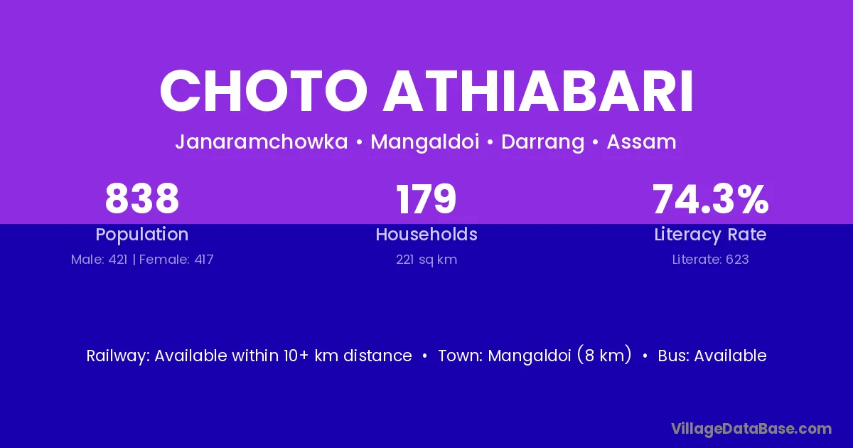 Choto Athiabari village has a total population of 838 people, of which 421 are males and 417 are females.