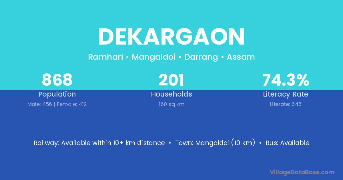 Mangaldoi (10 km) is the nearest town to Dekargaon village for major economic activities and is located approximately 10 km away.