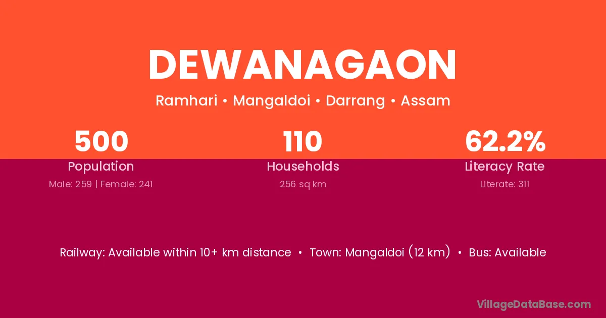 Mangaldoi (12 km) is the nearest town to Dewanagaon village for major economic activities and is located approximately 12 km away.