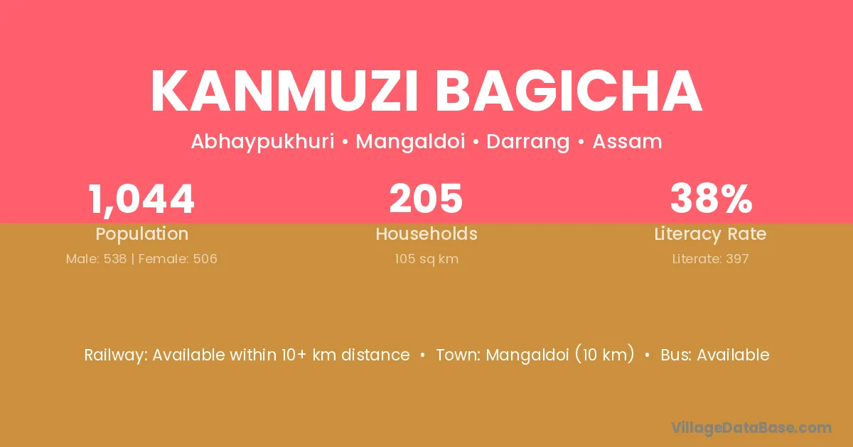 Mangaldoi (10 km) is the nearest town to Kanmuzi Bagicha village for major economic activities and is located approximately 10 km away.