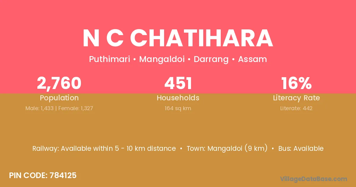 Mangaldoi (9 km) is the nearest town to N C Chatihara village for major economic activities and is located approximately 9 km away.