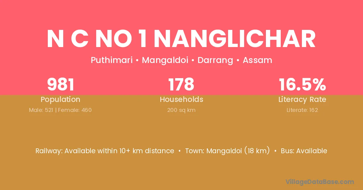 Mangaldoi (18 km) is the nearest town to N C No 1 Nanglichar village for major economic activities and is located approximately 18 km away.