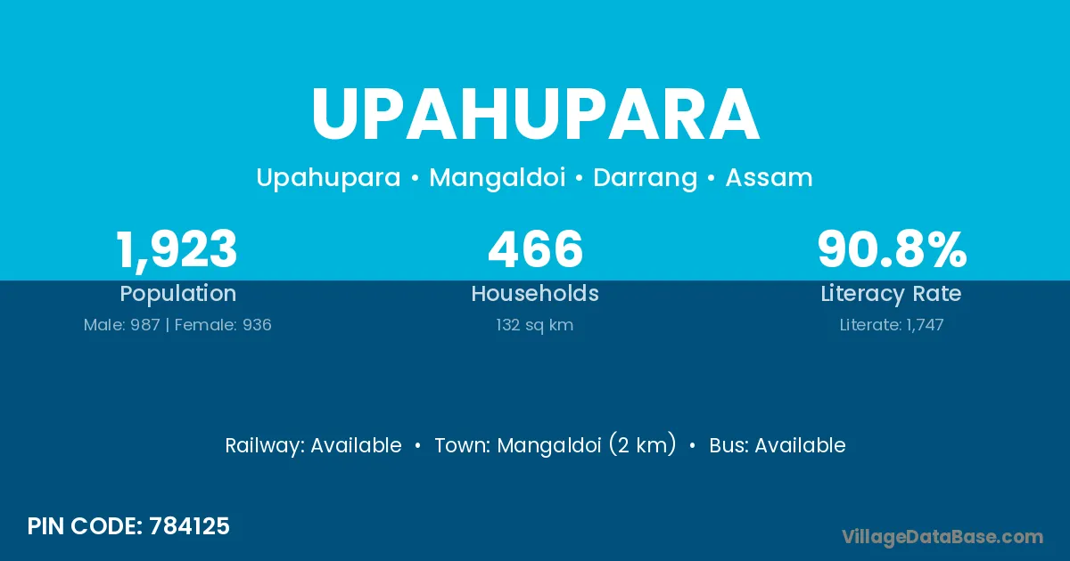 Mangaldoi (2 km) is the nearest town to Upahupara village for major economic activities and is located approximately 2 km away.