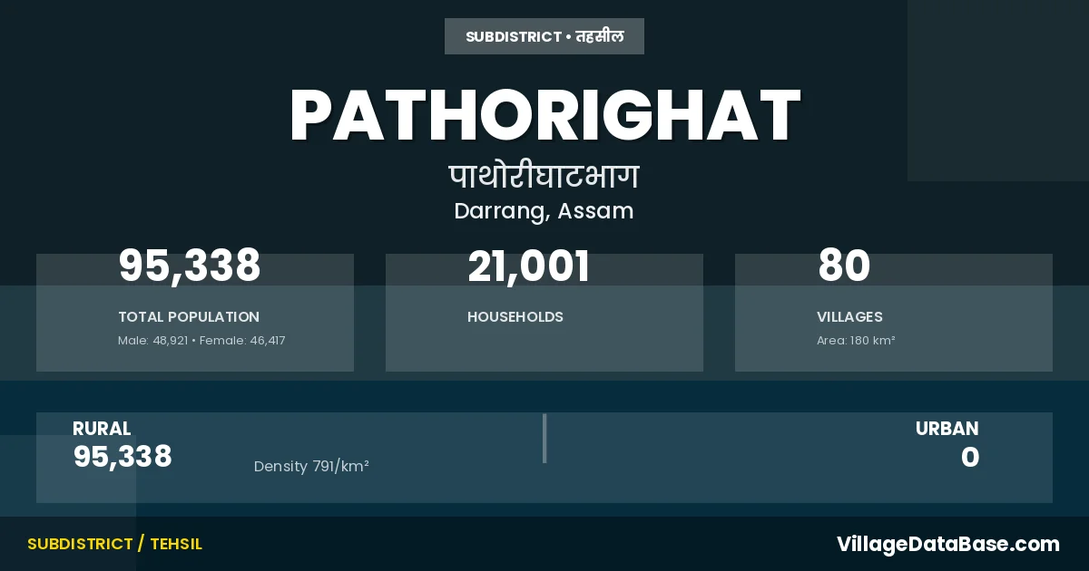 According to the 2011 census The total area of Pathorighat Subdivision is 180 km², with a population of 95338 people. The population density is 791 inhabitants per square kilometre, and there are approximately 21001 houses in the sub district.