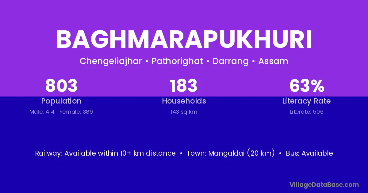 Mangaldai (20 km) is the nearest town to Baghmarapukhuri village for major economic activities and is located approximately 20 km away.