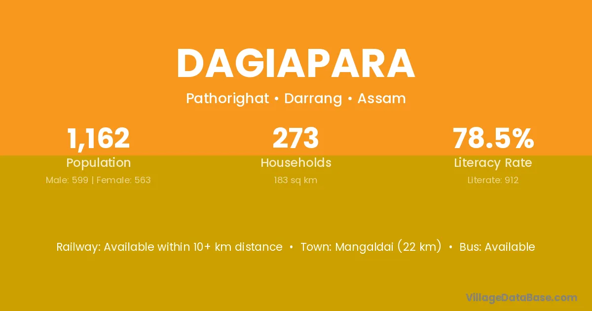 Mangaldai (22 km) is the nearest town to Dagiapara village for major economic activities and is located approximately 22 km away.