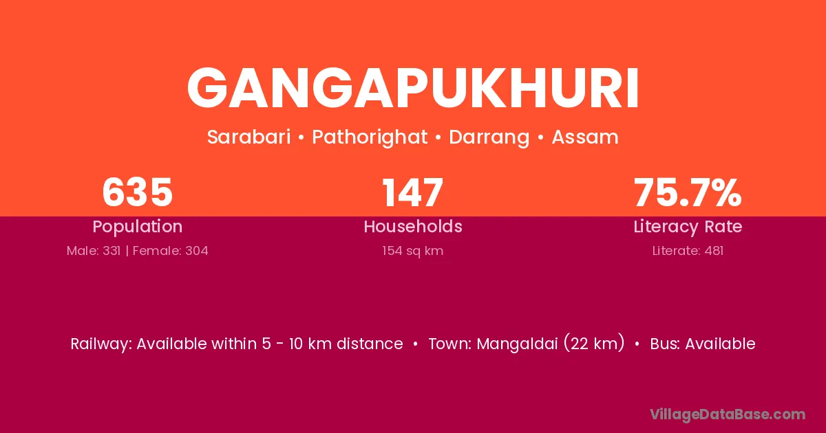 Mangaldai (22 km) is the nearest town to Gangapukhuri village for major economic activities and is located approximately 22 km away.