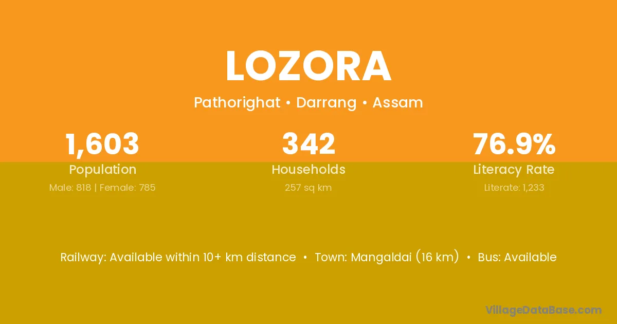 Mangaldai (16 km) is the nearest town to Lozora village for major economic activities and is located approximately 16 km away.