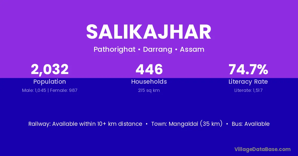 Mangaldai (35 km) is the nearest town to Salikajhar village for major economic activities and is located approximately 35 km away.