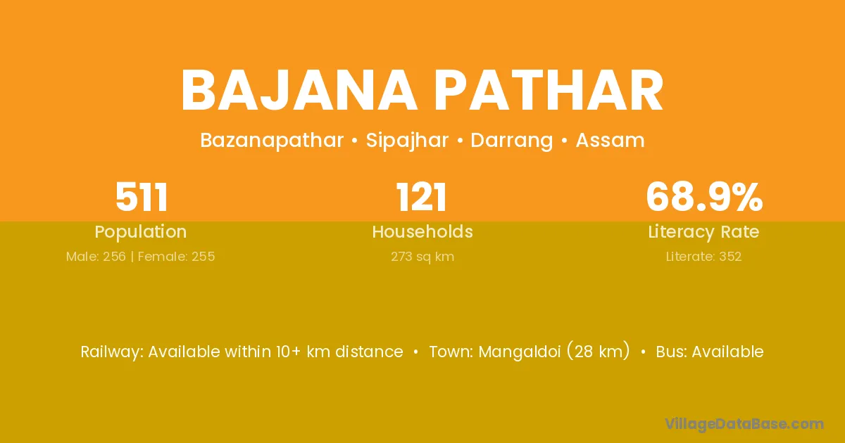 Mangaldoi (28 km) is the nearest town to Bajana Pathar village for major economic activities and is located approximately 28 km away.