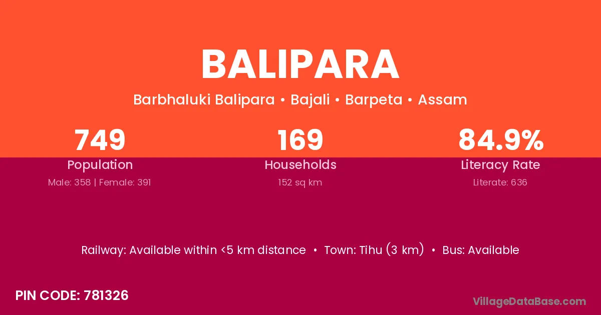 Mangaldoi (12 km) is the nearest town to Balipara village for major economic activities and is located approximately 12 km away.