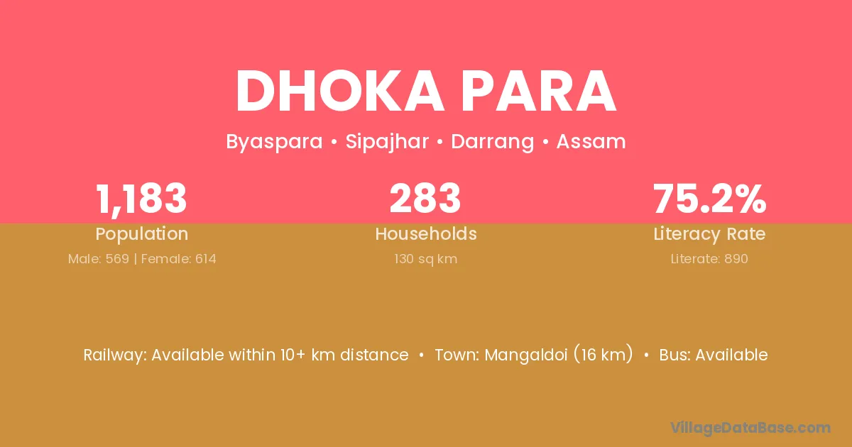 Mangaldoi (16 km) is the nearest town to Dhoka Para village for major economic activities and is located approximately 16 km away.