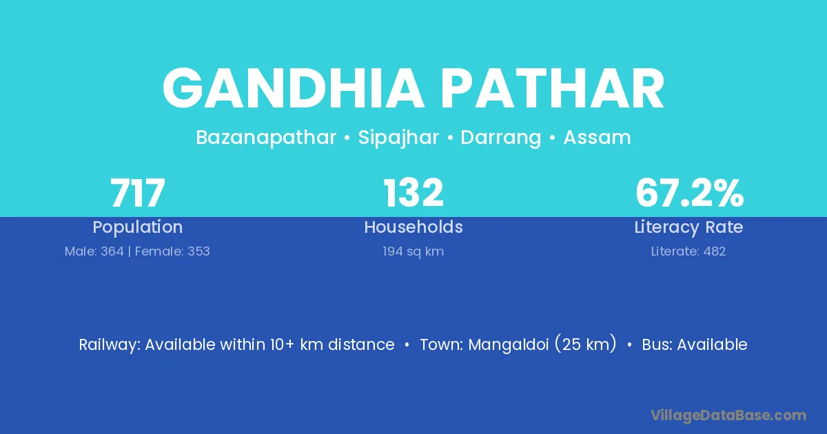 Mangaldoi (25 km) is the nearest town to Gandhia Pathar village for major economic activities and is located approximately 25 km away.