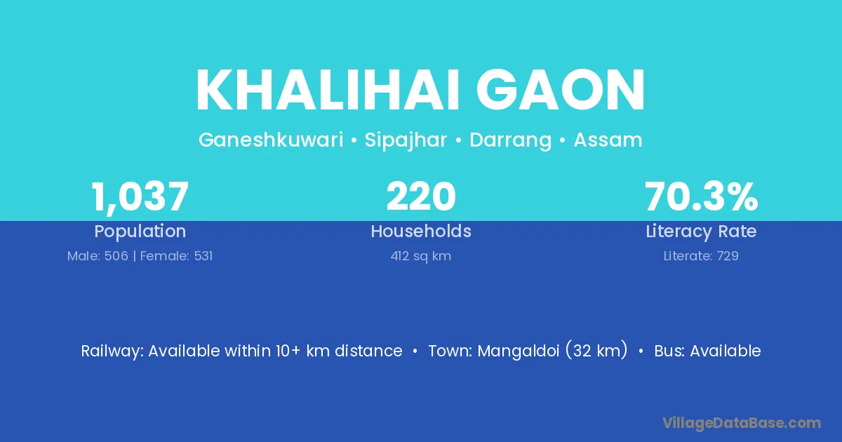 Khalihai Gaon village has a total population of 1,037 people, of which 506 are males and 531 are females.
