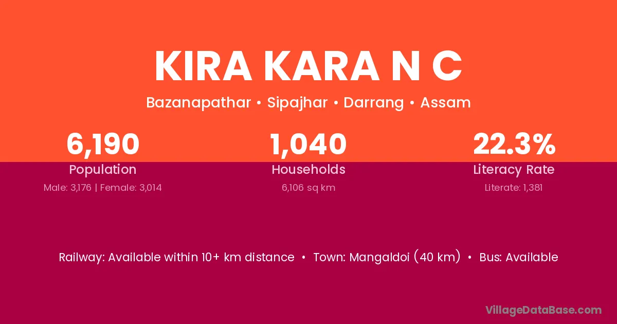 Mangaldoi (40 km) is the nearest town to Kira Kara N C village for major economic activities and is located approximately 40 km away.