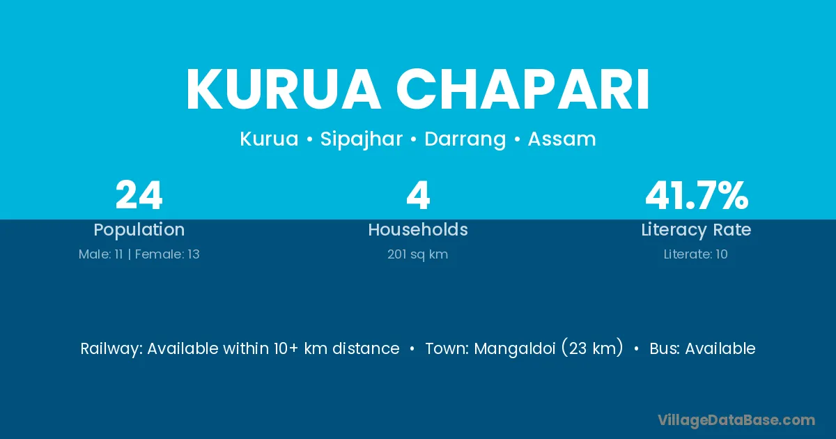 Mangaldoi (23 km) is the nearest town to Kurua Chapari village for major economic activities and is located approximately 23 km away.