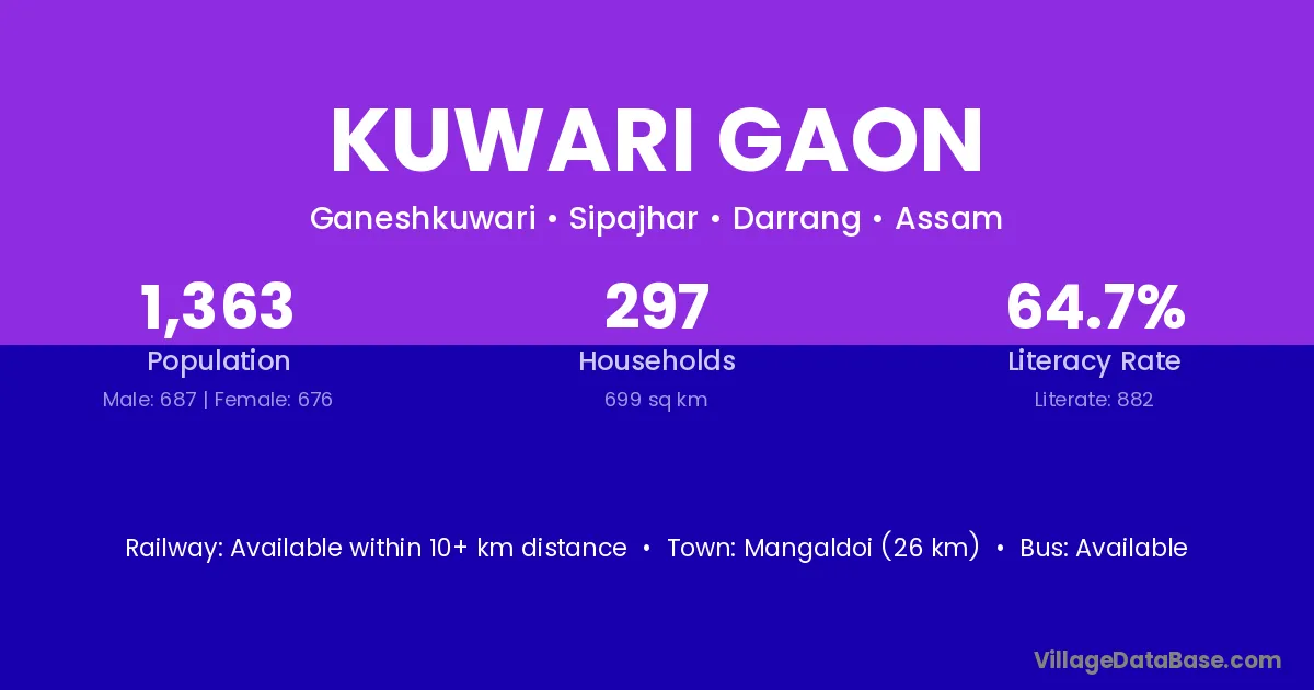 Mangaldoi (26 km) is the nearest town to Kuwari Gaon village for major economic activities and is located approximately 26 km away.