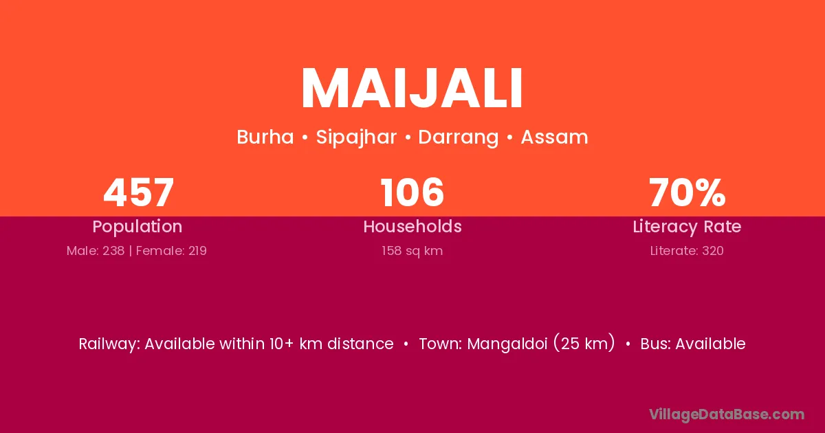 Mangaldoi (25 km) is the nearest town to Maijali village for major economic activities and is located approximately 25 km away.