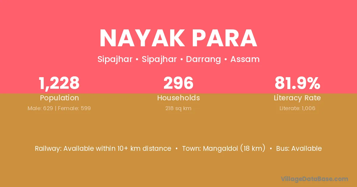 Mangaldoi (18 km) is the nearest town to Nayak Para village for major economic activities and is located approximately 18 km away.