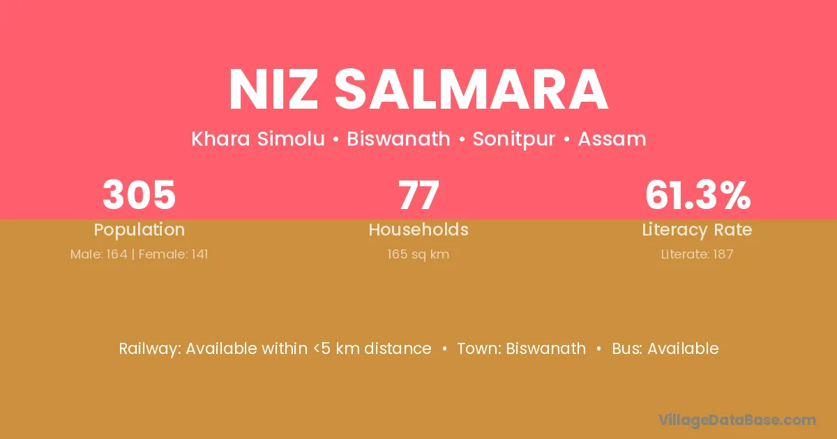 The literacy rate of Niz Salmara village is 24.87%. Male literacy stands at 26.32% and female literacy at 23.39%.