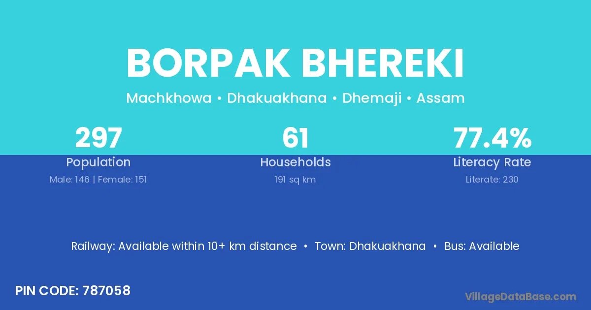 Borpak Bhereki village has a total population of 297 people, of which 146 are males and 151 are females.