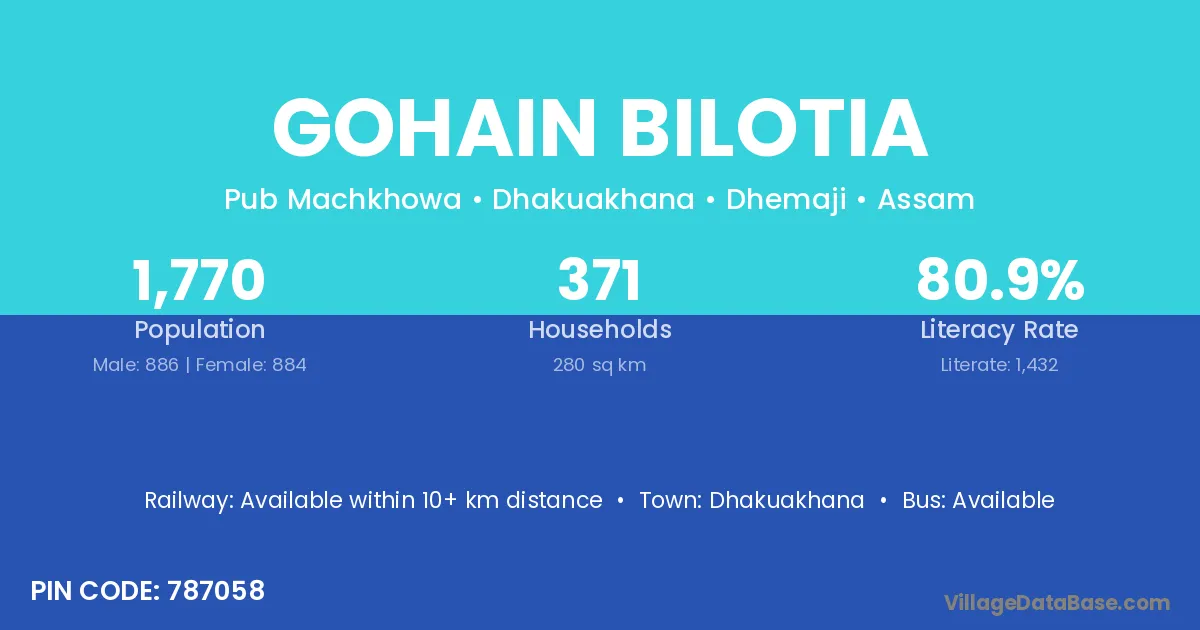 Gohain Bilotia village has a total population of 1,770 people, of which 886 are males and 884 are females.