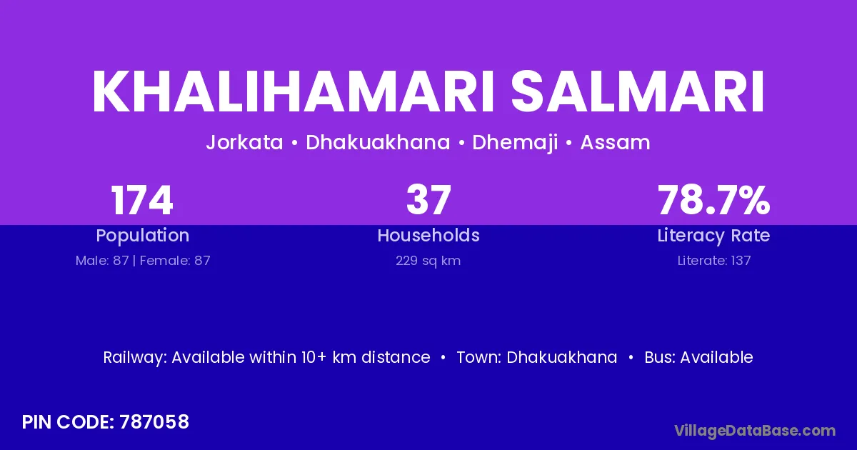 Khalihamari Salmari village has a total population of 174 people, of which 87 are males and 87 are females.