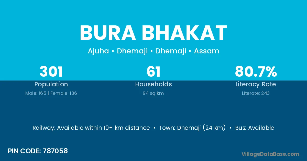 Dhemaji (24 km) is the nearest town to Bura Bhakat village for major economic activities and is located approximately 24 km away.