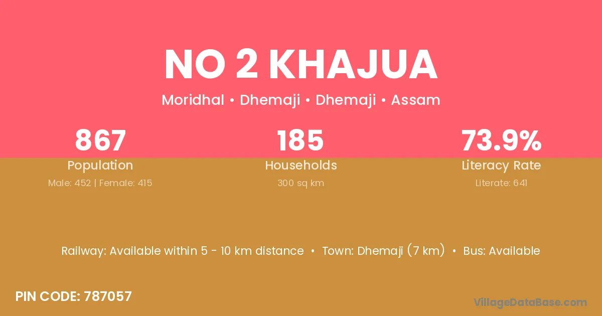Dhemaji (7 km) is the nearest town to No 2 Khajua village for major economic activities and is located approximately 7 km away.
