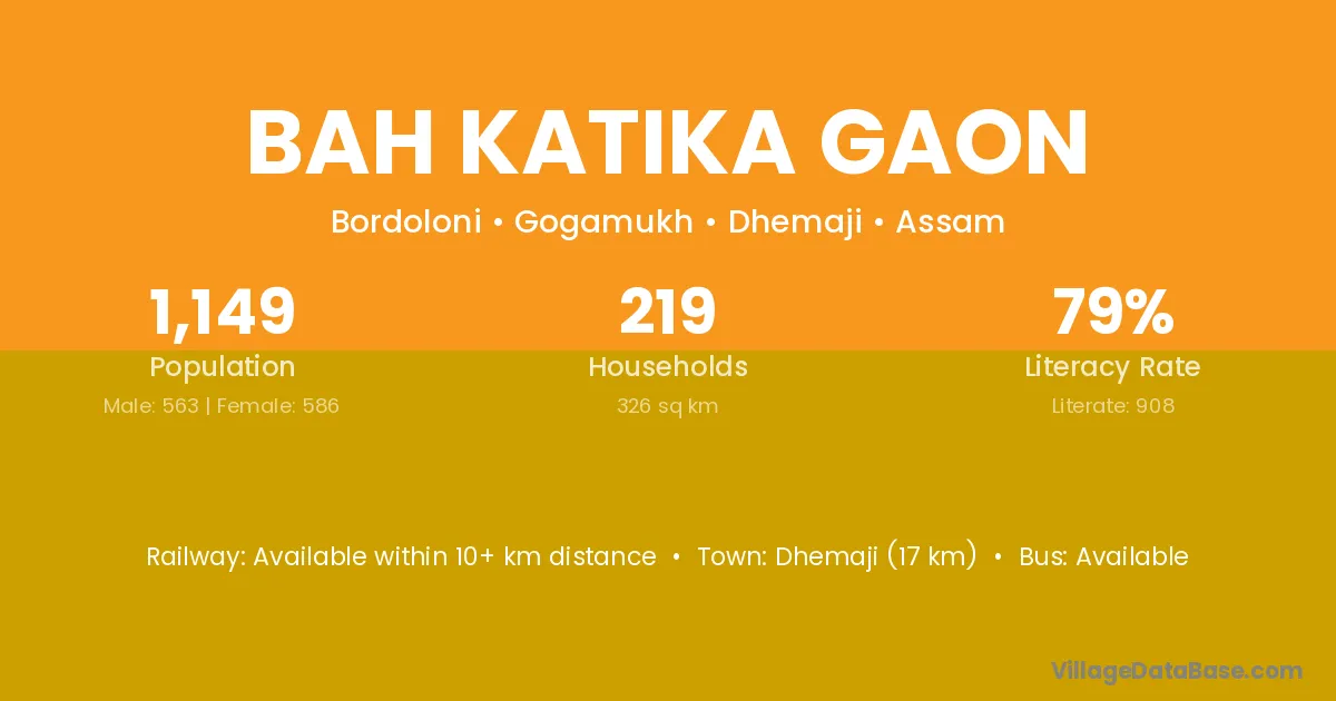 Dhemaji (17 km) is the nearest town to Bah Katika Gaon village for major economic activities and is located approximately 17 km away.