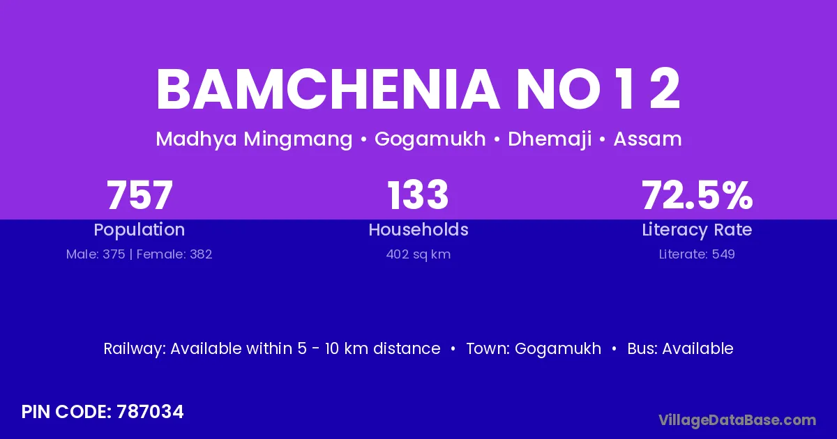 Bamchenia No 1 2 village has a total population of 757 people, of which 375 are males and 382 are females.