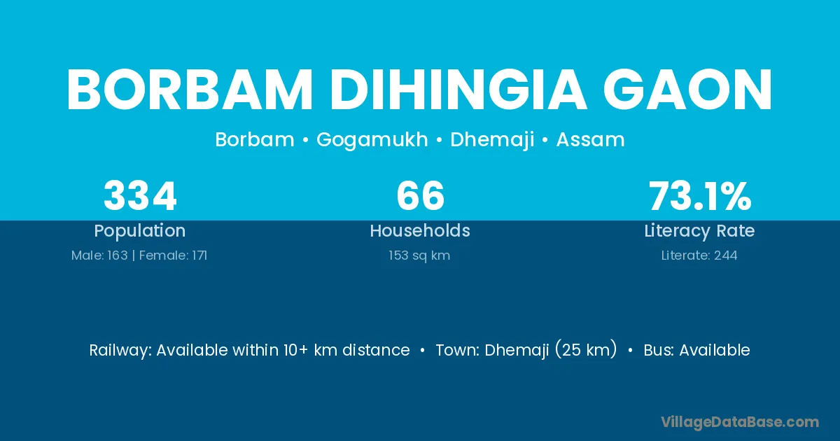 Borbam Dihingia Gaon village has a total population of 334 people, of which 163 are males and 171 are females.